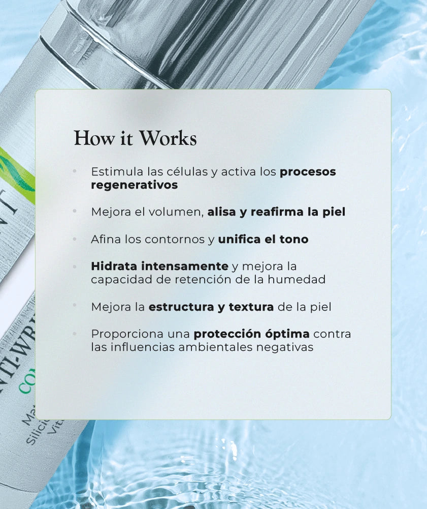 Anti-Wrinkle Complex™ strengthens, hydrates, and protects the face.