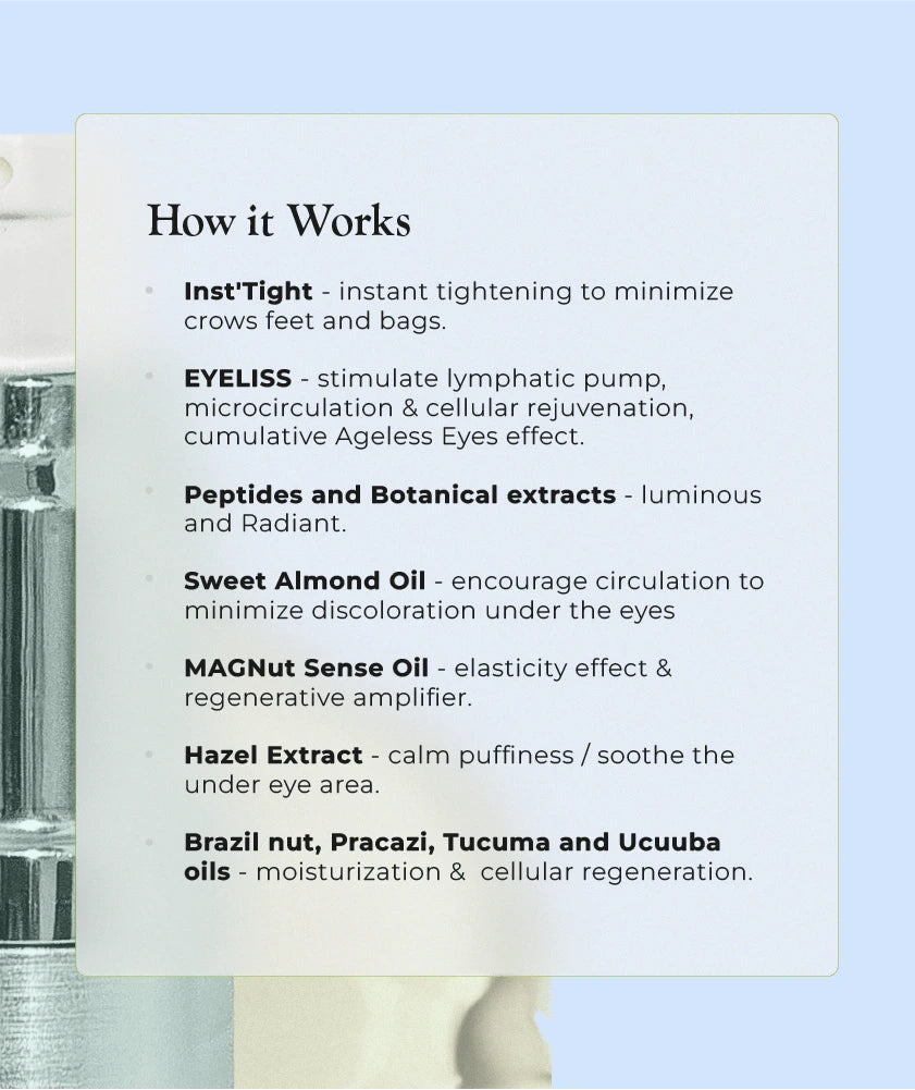 Ageless Eyes combina dos tipos de activos con funciones complementarias: uno con efecto visible en minutos y otro que actúa progresivamente para mejorar firmeza, tono y textura. A diferencia de muchas marcas que utilizan estos ingredientes en cantidades mínimas solo para hacer reclamos, nosotros igualamos o superamos las concentraciones empleadas en los estudios clínicos originales. El resultado: eficacia real y sostenida, sin atajos.