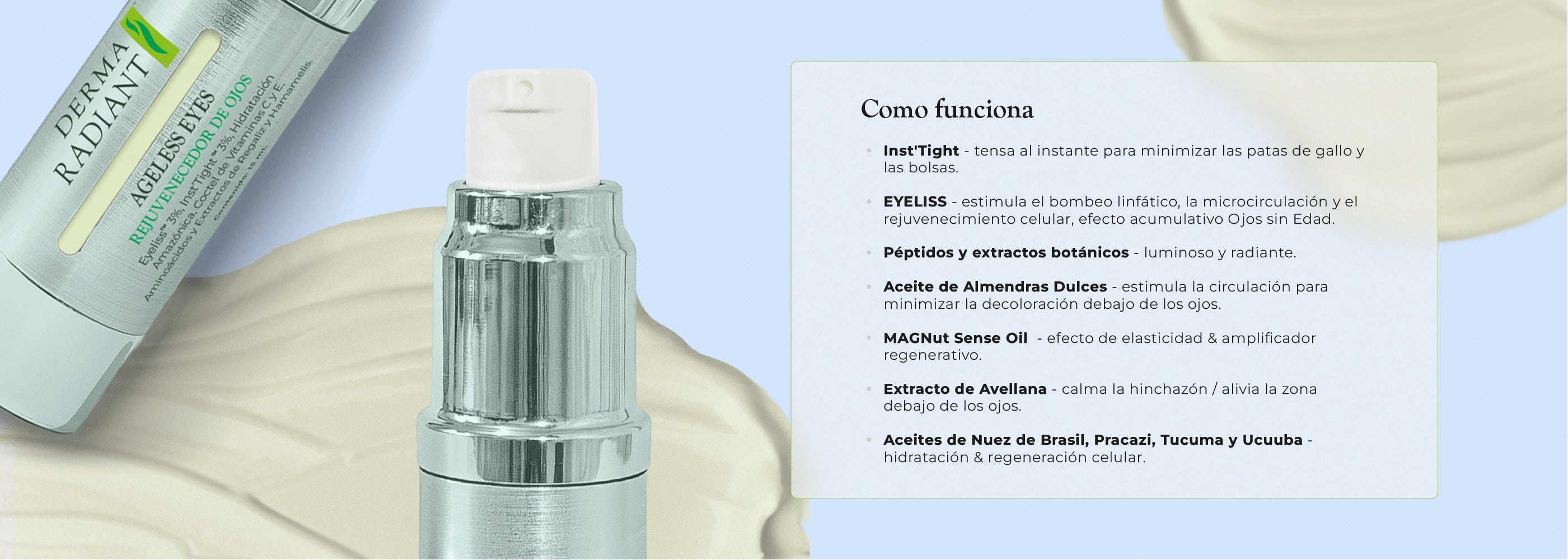 Ageless Eyes combina dos tipos de activos con funciones complementarias: uno con efecto visible en minutos y otro que actúa progresivamente para mejorar firmeza, tono y textura. A diferencia de muchas marcas que utilizan estos ingredientes en cantidades mínimas solo para hacer reclamos, nosotros igualamos o superamos las concentraciones empleadas en los estudios clínicos originales. El resultado: eficacia real y sostenida, sin atajos.