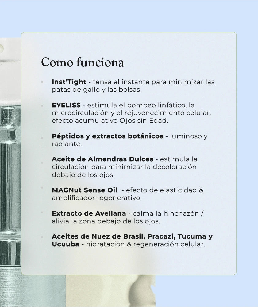 Impulsado por péptidos clínicos, antioxidantes botánicos y polímeros vegetales, combate bolsas, ojeras y signos de fatiga, revelando una mirada más luminosa, suave y revitalizada.